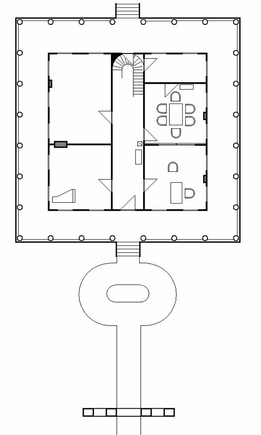 Erdgeschoss: Drehorte für Auffahrt, Veranda, Diele, Salon (unten rechts), Speisezimmer (rechts), Musikzimmer (unten links) und Treppe
