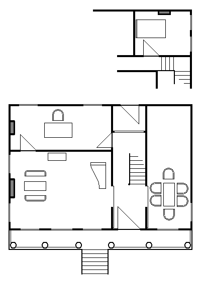 Unten: Erdgeschoss mit Aufgang, Veranda, Diele, Salon (links unten), Nebenzimmer (links oben). Oben: Obergeschoss (Ausschnitt) mit Treppe und Schlafzimmer.