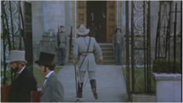 Als Außenansicht des "Weißen Hauses der Konföderation" dient die nördliche Seite der Saint Philips-Kirche in Charleston, welche mit der zugehörigen Church Street im Kapitel "Charleston" ausführlich vorgestellt wird. Die seitlich gezeigten Säulen und der eher schlichte, seitliche Zugang mit kleiner Treppe sind dem Original durchaus nicht unähnlich (siehe weiter unten). Der Eingang befindet sich auf der Nordseite der Kirche, unmittelbar unterhalb des Turmes. Die dortigen vier Säulen werden durch die Kameraführung, die davor postierten Soldaten und das schmiedeeiserne Tor einigermaßen kaschiert.