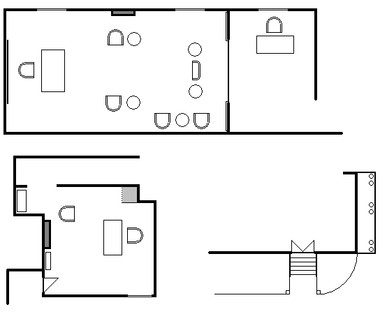 Oben: Präsidentenbüro und Vorzimmer, unten rechts Eingangsbereich außen, unten links Orry's Büro