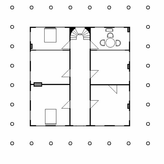 Obergeschoss: Drehorte für Flur, Madeline's Zimmer (vor der Gefangenschaft, oben rechts), gemeinsames Schlafzimmer (oben links), Gästezimmer (während der Gefangenschaft, unten links).