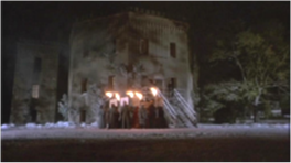 This outdoor filming location was the former state prison of Charleston, SC. The main building extends to the octagonal cell tower shown here. The building was constructen in 1802 and gradually extended until 1939. It can be visited today. The outer wodden stairs had been altered since the time of filming. The real main entrance is to the other side (see aerial view © Google Maps):