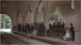 This street on the outsoor set "Midwest Street" of Warner Brothers in Burbank, CA is used for many scenes and openings of Lehigh Station. Here, George and Orry ride a carriage to Belvedere on her West Point vacation. Geoge and Constance are watching the election parade in 1860, and Stanley and Isabel drop off Maude before seeing Mr. Morgan. The bay windows are used in the uprising scene after the fall of Fort Sumter, as a Jefferson Davis-puppet is dropped from there hanging on a rope.