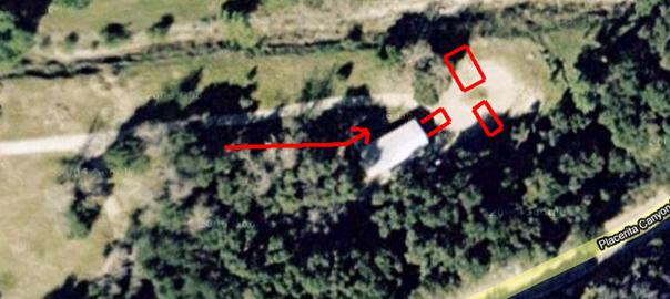 The areal view shows the roof of the "farm house". The veranda is located on the upper edge in the shadow of the trees, above that the former paddock. The non-existant kitchen extension and the outbuildings are marked in red. The characters in the movie are approaching not using the driveway but out of the woods to the left (red arrow). © Google Maps